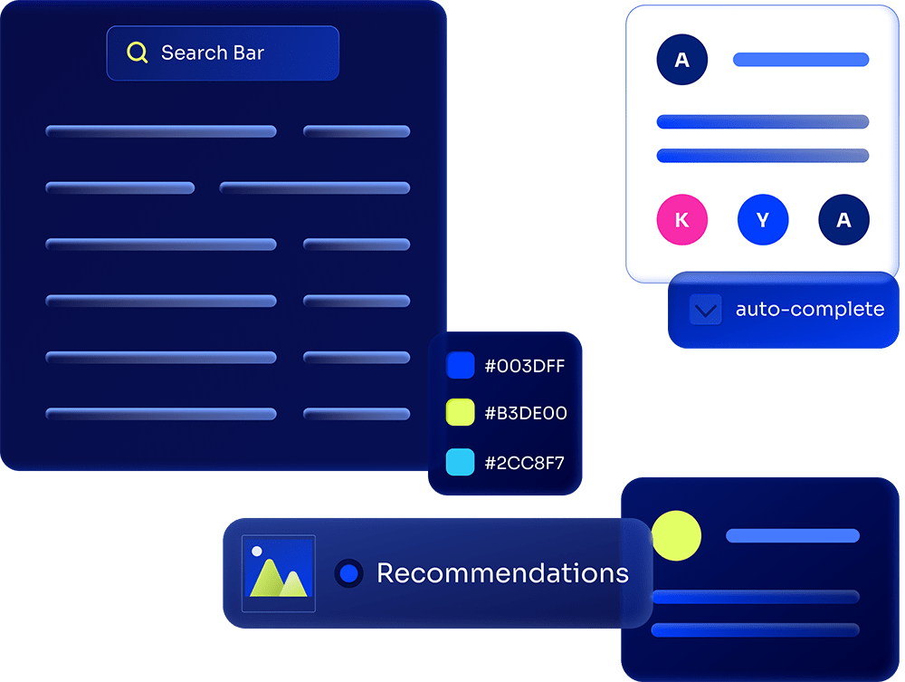 Build your front end with InstantSearch, offering seamless integration of both recommendation and search components, customizing your user experience with minimal effort.