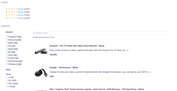 InstantSearch’s goal is to help you implement awesome search experiences as smoothly as possible by providing a complete search ecosystem. InstantSearch tackles an important part of this vast goal by providing frontend widgets that you can assemble into unique search interfaces.