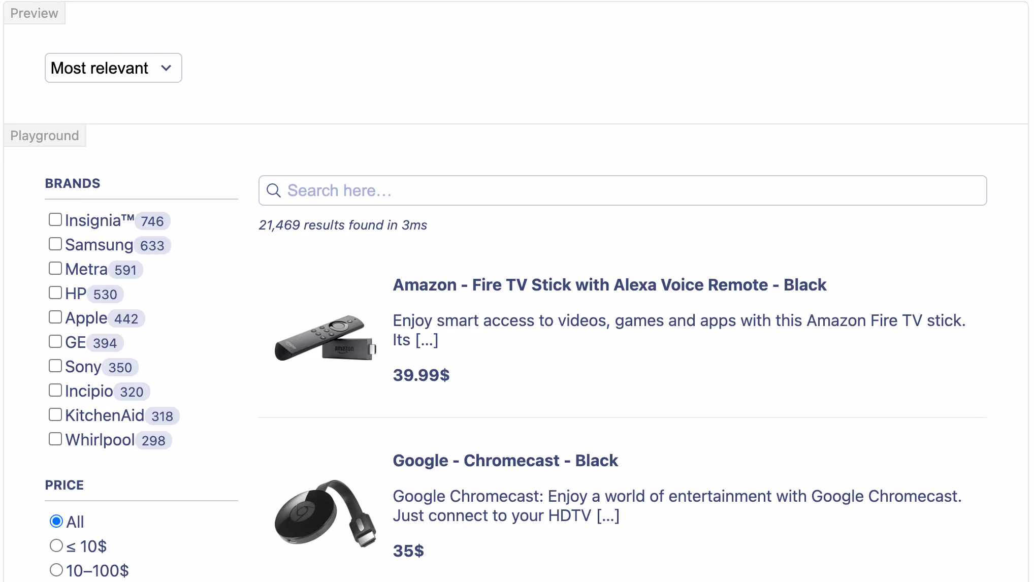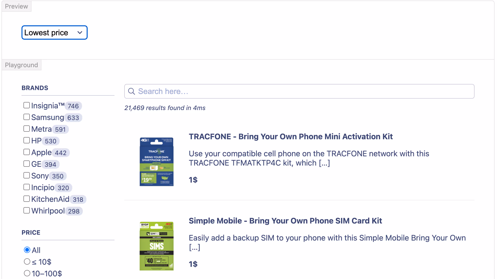 InstantSearch’s goal is to help you implement awesome search experiences as smoothly as possible by providing a complete search ecosystem. InstantSearch tackles an important part of this vast goal by providing frontend widgets that you can assemble into unique search interfaces.