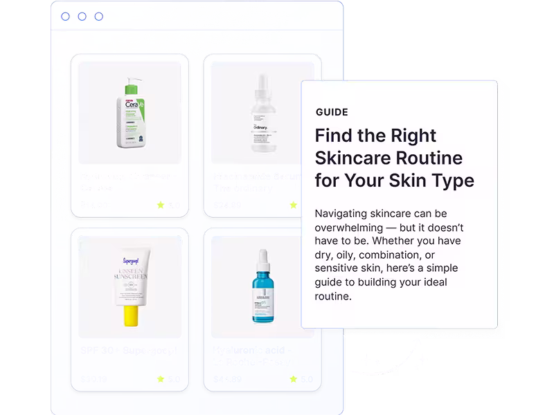 Guides are AI-generated content pieces that help shoppers make informed purchasing decisions. They transform product catalog data into engaging, informative content that keeps shoppers on your site during the research phase of their journey, rather than losing them to third-party review sites. Guides come in three formats: general Shopping Guides, Category Guides, and Comparison Guides.